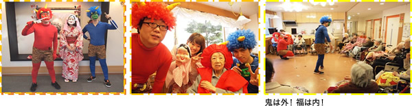 前日には、ご入居者の皆様も鬼になりきって他のご入居者や職員を驚かせ、節分の雰囲気を楽しみました。