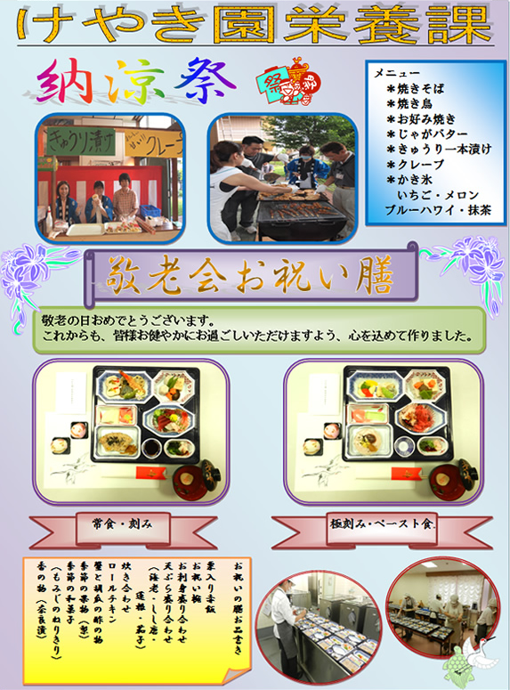 栄養課では、季節の節句を中心にイベント食を行っています。毎月の暦に合わせたメニューを作成し、お食事を通して季節を感じることができると、大変ご好評をいただいております。